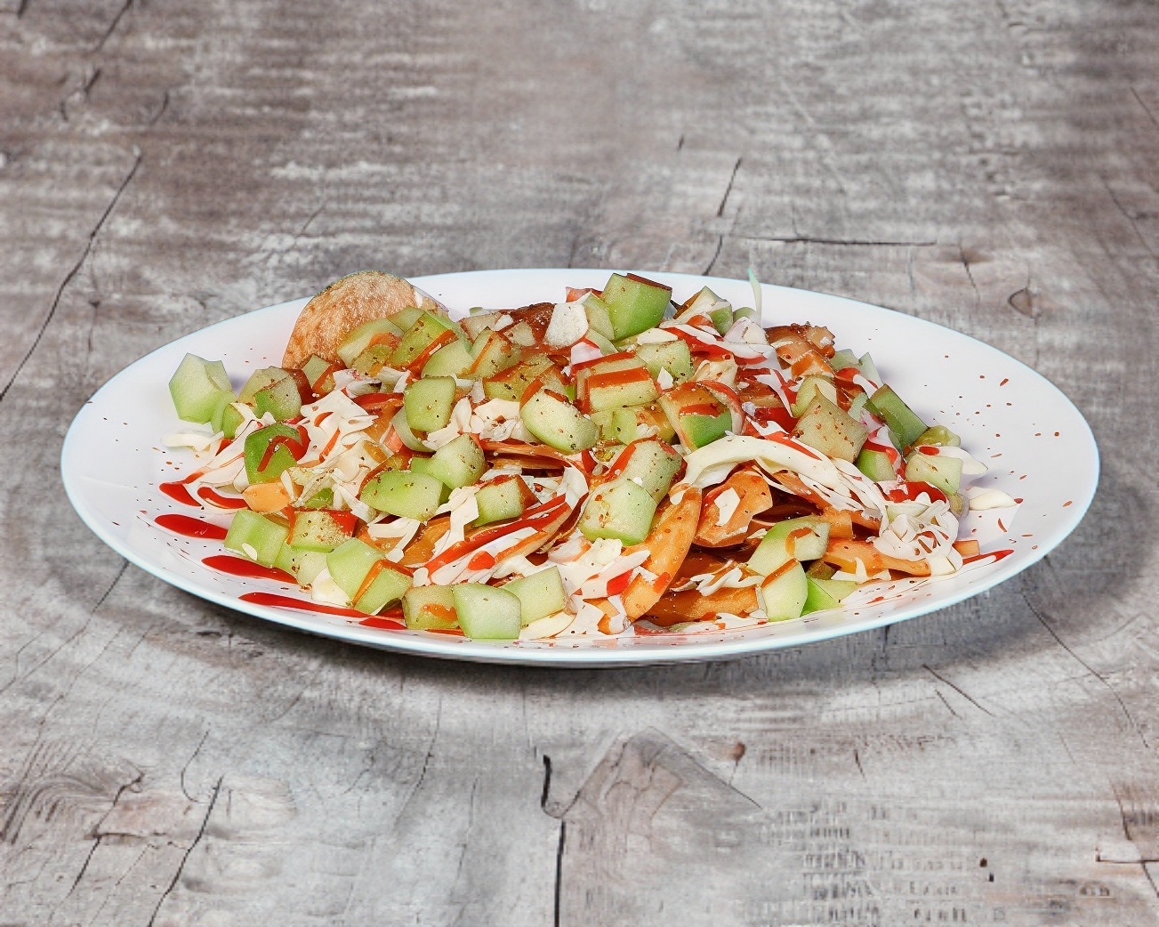 Sabritas con repollo, pepino, clamato, salsas y limon.