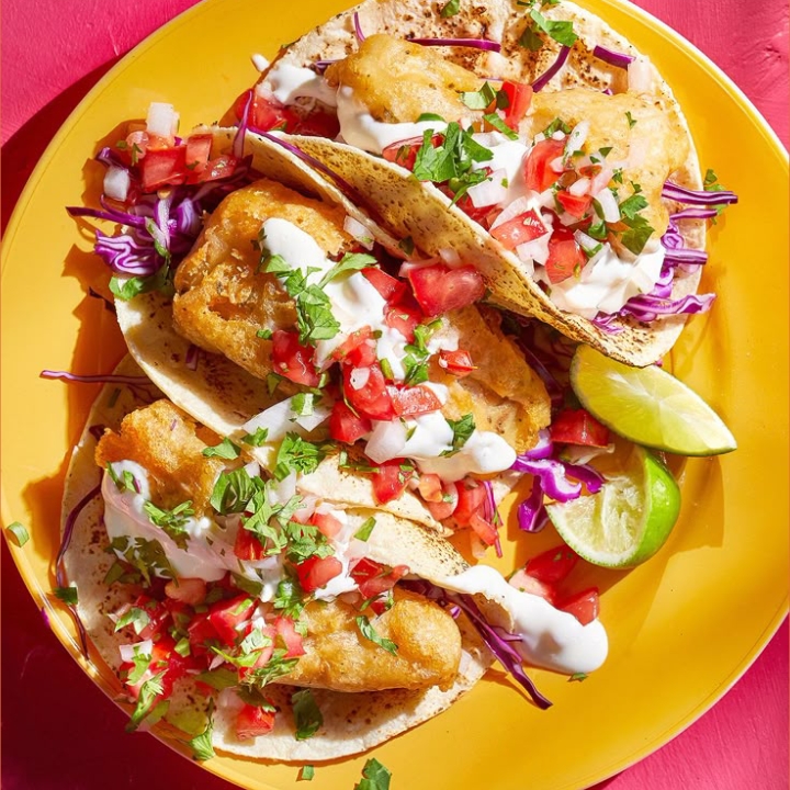 Tortilla de maiz, camaron capeado, ensalada de repollo y zanahoria, verdura, aderezos y limones