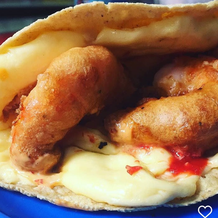 Dos tortillas de harina gordta , queso gratinado, camaron capeado, ensalada de repollo y zanahoria, verdura, aderezo, limones y papas a la francesa gratis