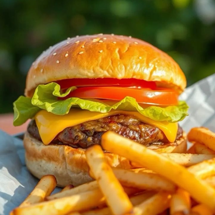 Dos carnes sirlon, mayonesa, tomate, lechuga, cebolla, aguacate y queso, acompañada de papas a la francesa y jalapeños