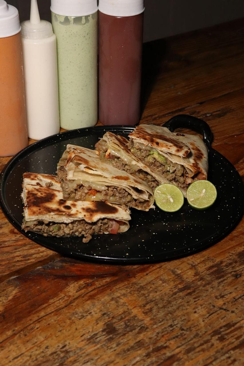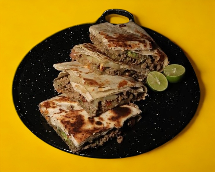 Queso, aguacate, tomate, carne adobada y a la plancha.