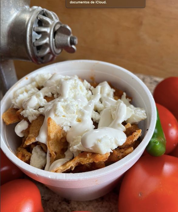 Porcion de chilaquiles rojos o verdes con queso, media crema y pollo. Mas un agua de sabor.