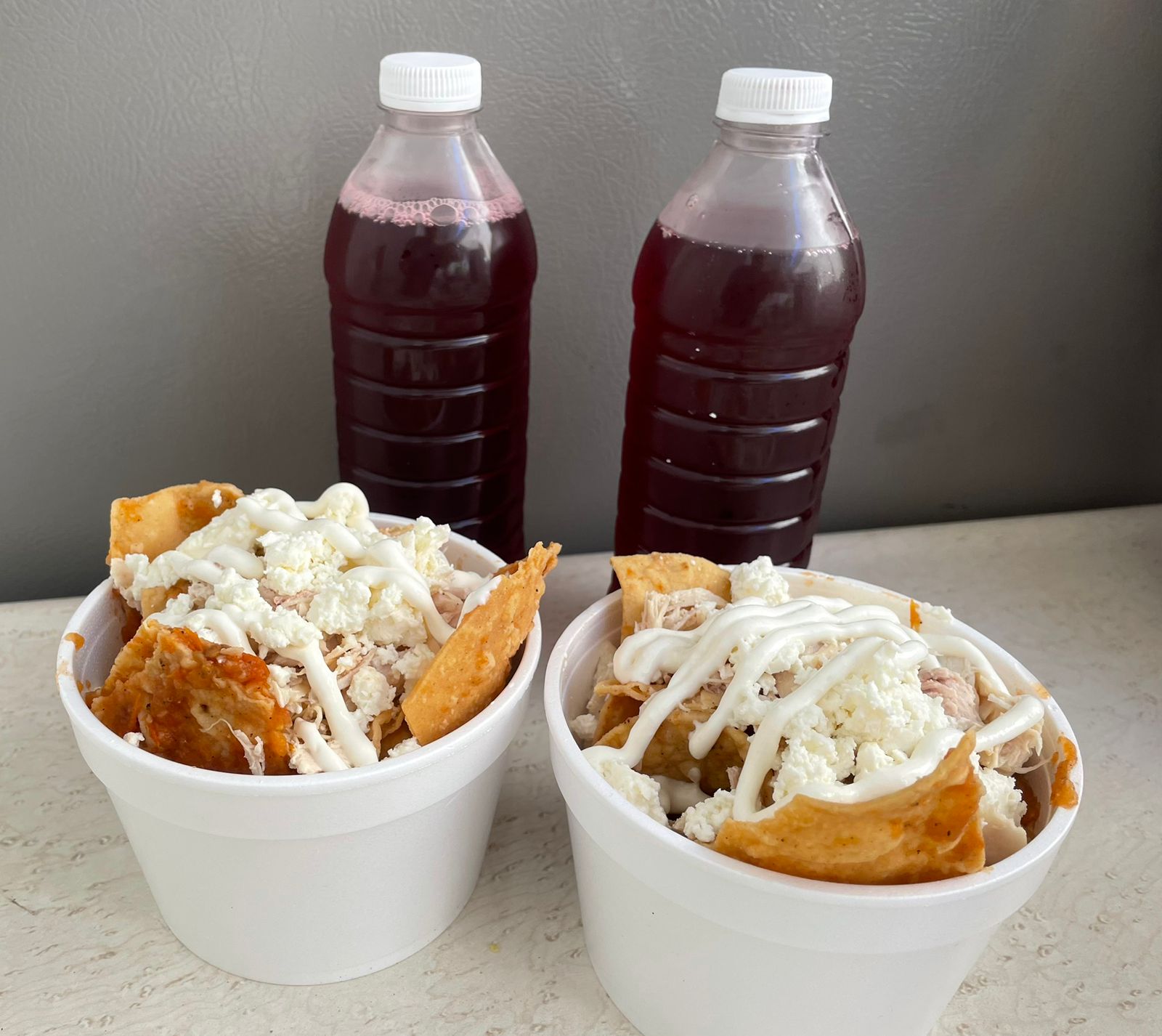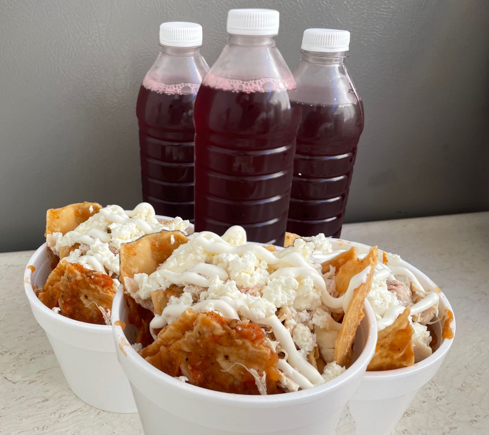 Tres porciones de chilaquiles verdes o rojos con queso, media crema y pollo. Con tres bebidas de sabor.