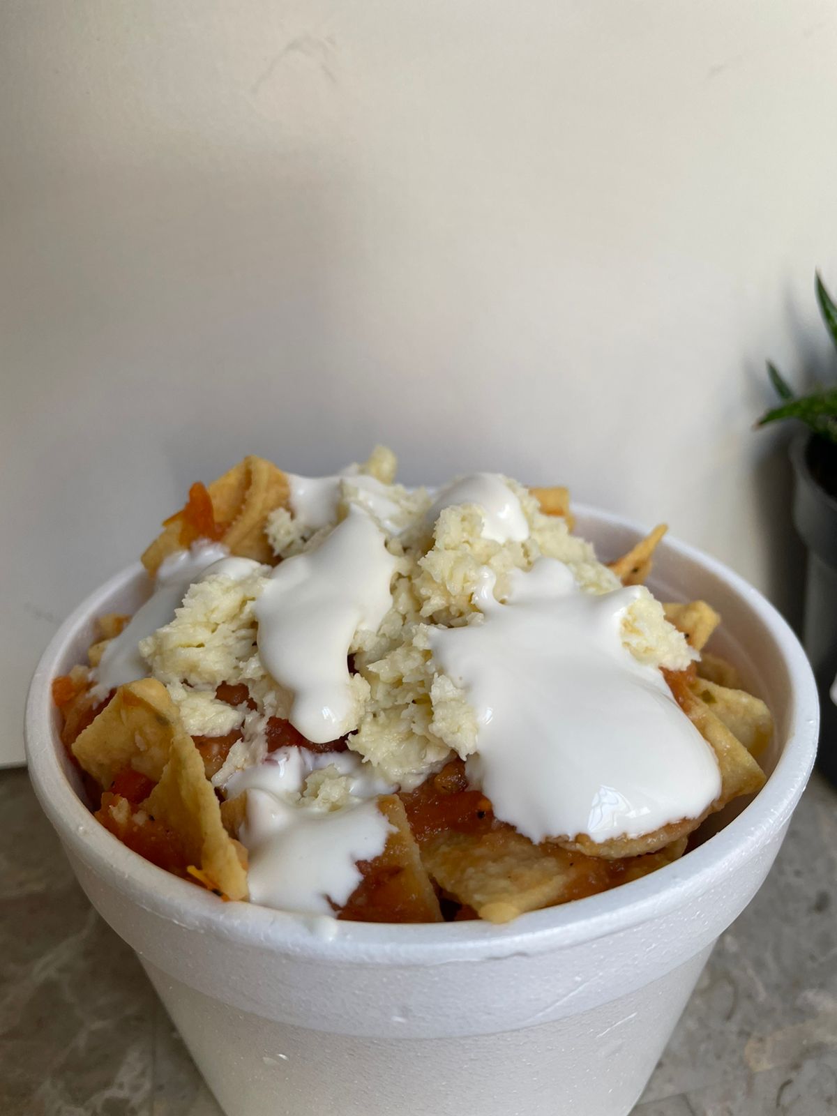 Chilaquiles rojos con queso y media crema. Salsa picante se agrega al gusto aparte.