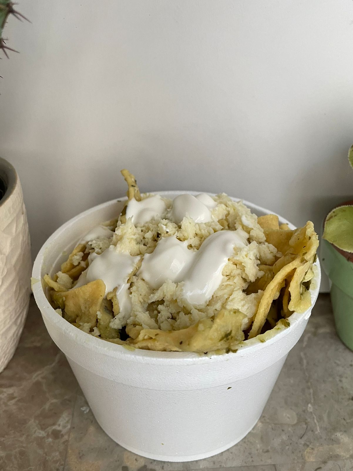 Chilaquiles verdes con queso y media crema. Salsa picante se agrega aparte al gusto.