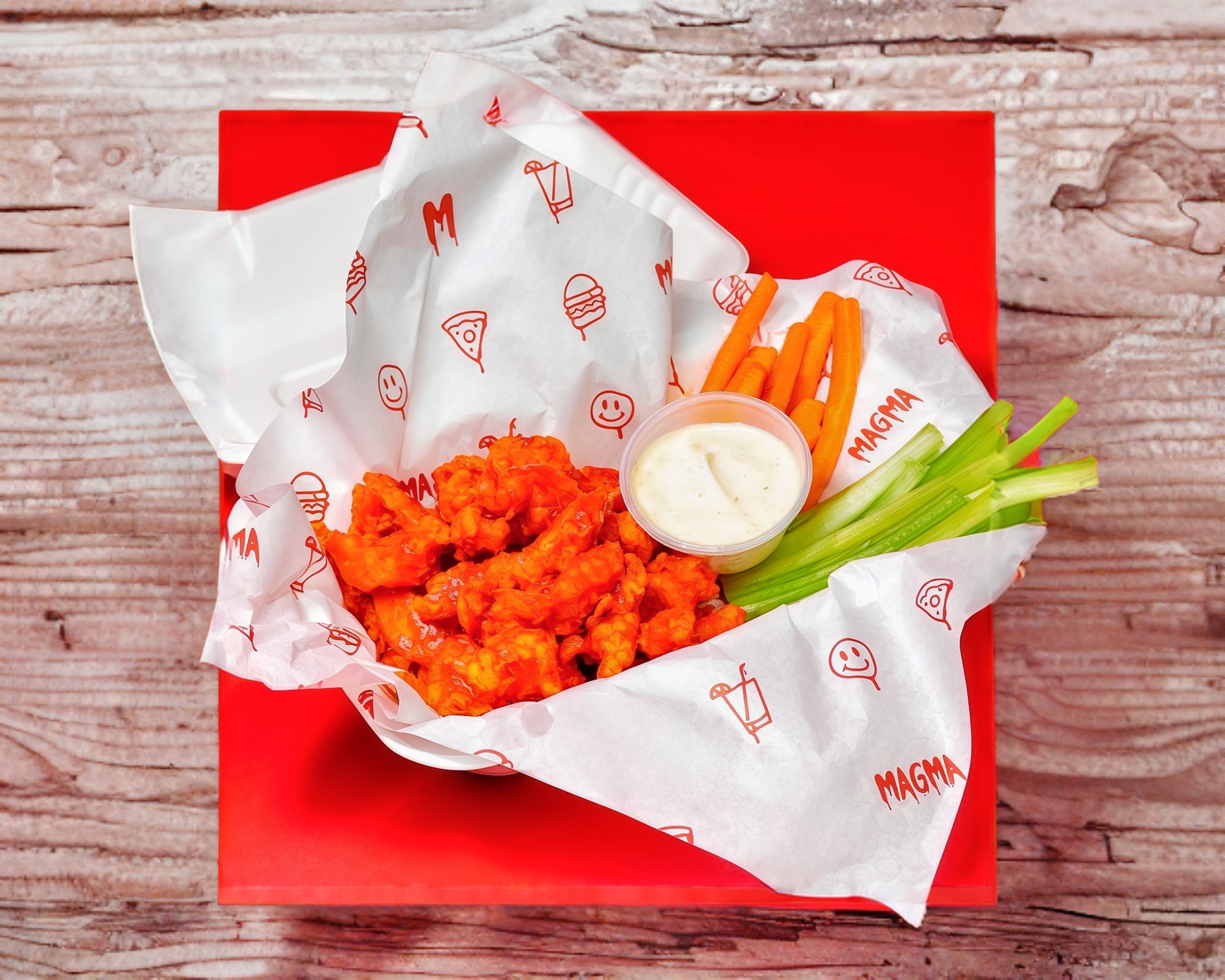 300 Gramos de tiras de pollo sin hueso, empanizadas en panko. (bañadas en una salsa especial a elegir), acompañadas de bastones de apio, zanahoria y aderezo ranch.