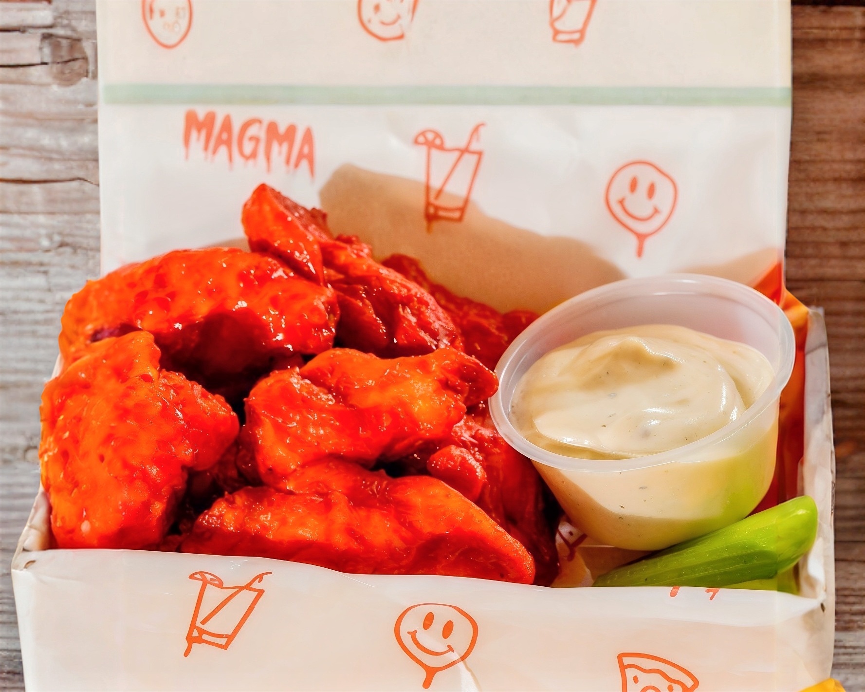 30 Piezas de crujientes alitas, elige 3 salsas y 3 aderezos. Incluye Bastones de zanahorita y apio.