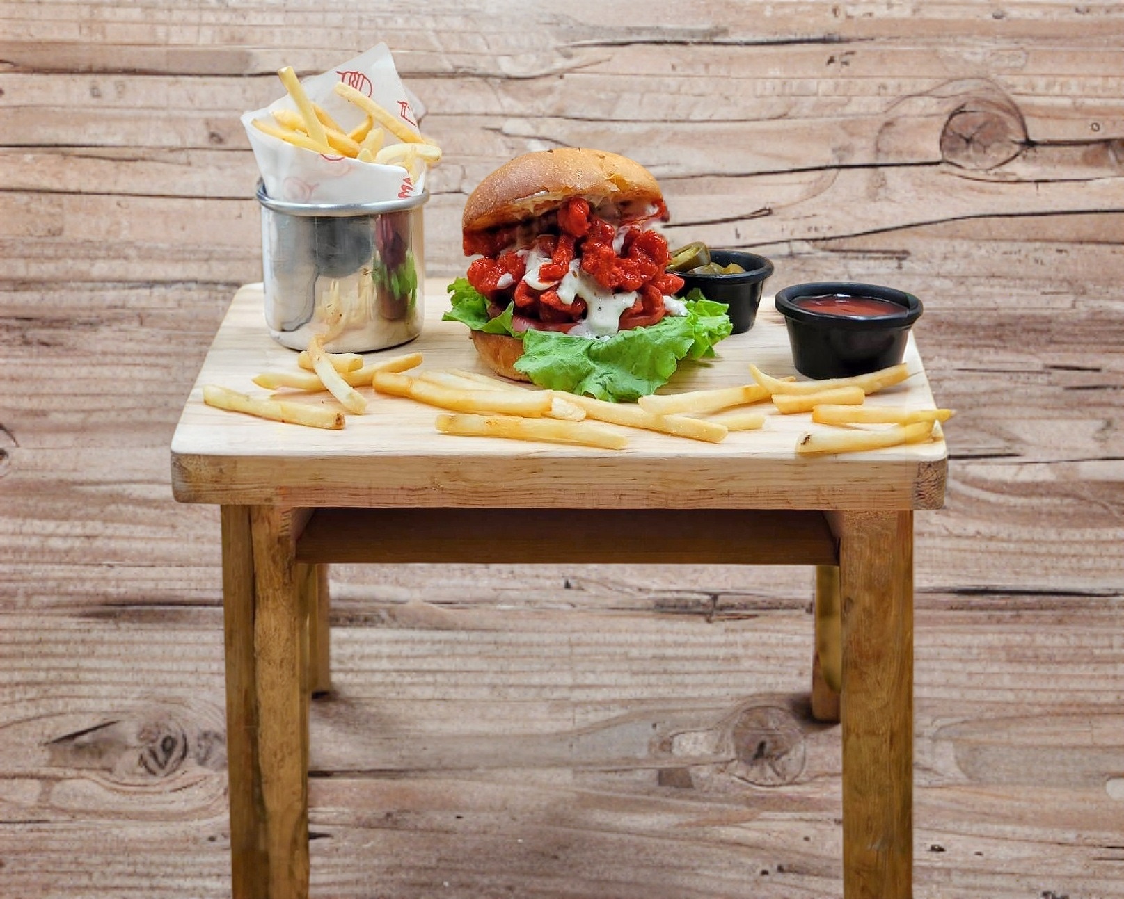 Pan brioche, 150 gr. de boneless con salsa a elegir, aderezo ranch, tomate y lechuga fritz. acompañada de papas a la francesa.