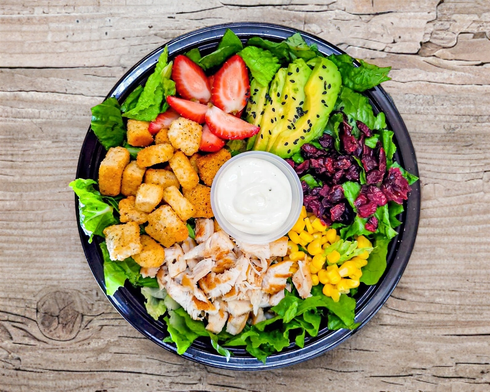Base de lechuga, acompañdado de elotitos, arandanos, aguacate, fresas, croutones y Pollo a la Plancha.