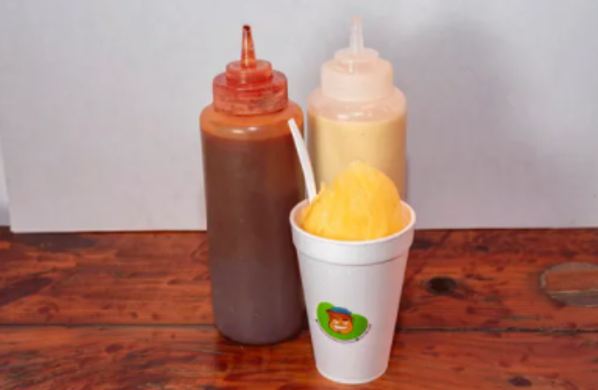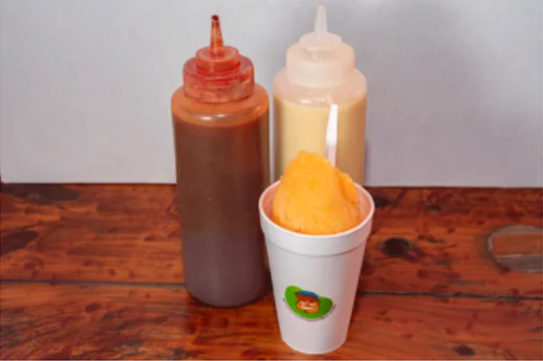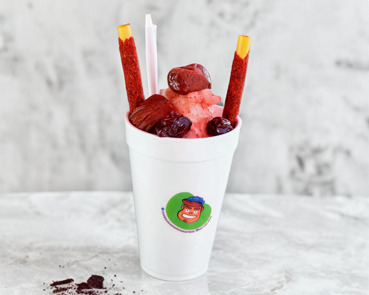 Hielito natural golpeado con un mazo hasta quedar finito como nieve de garrafa. Servido en un vaso de 16 onzas preparado con chamoy mega, tajín, 1 banderitas de tamarindo y hielito.