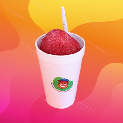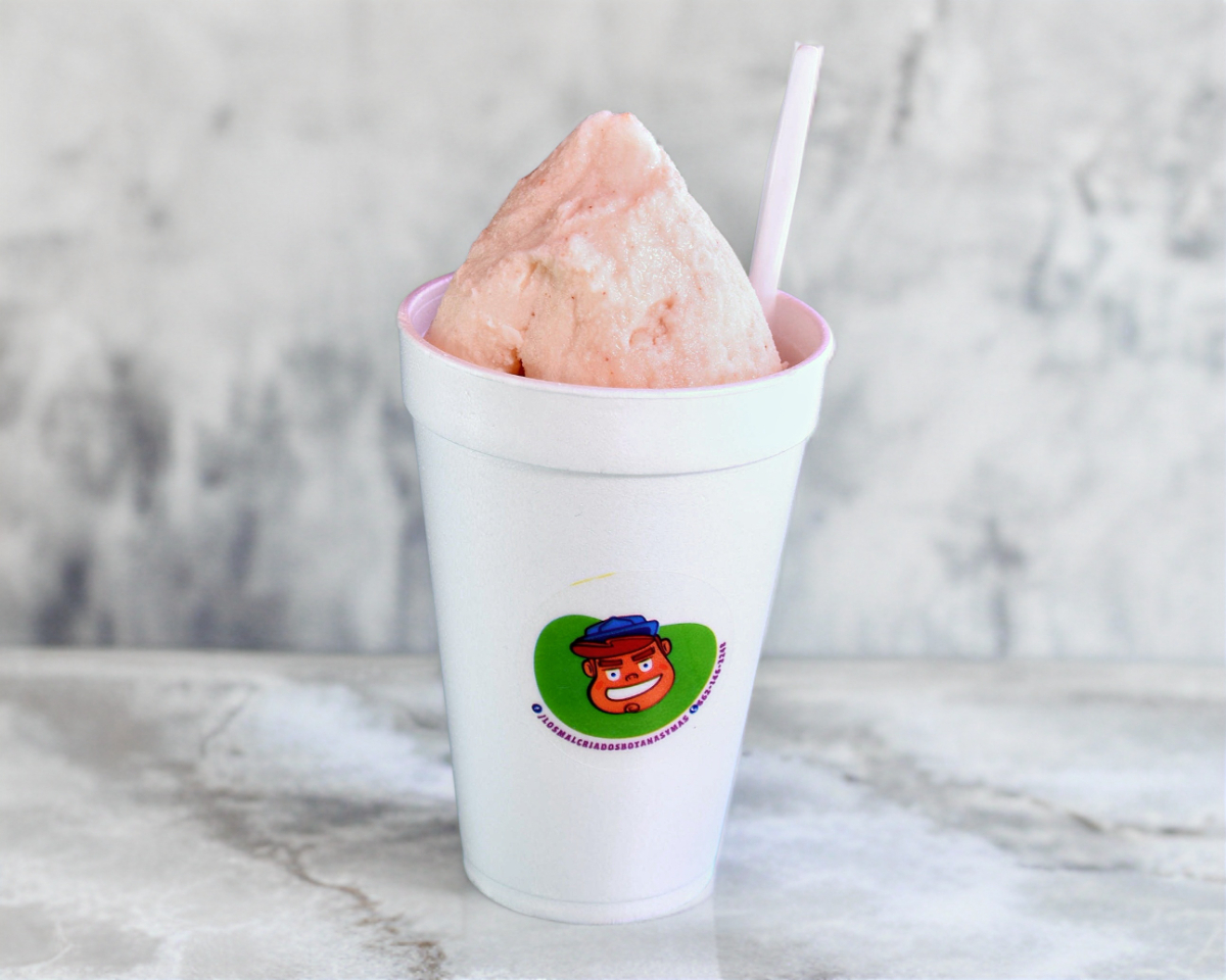 Hielito de fresa natural golpeado con un mazo hasta quedar finito como nieve de garrafa. Servido en vaso de 16 onzas