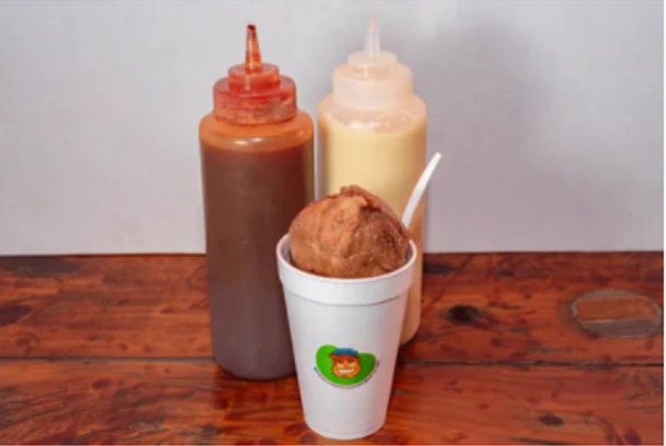 Hielito de mazapan golpeado con un mazo hasta quedar finito como nieve de garrafa. Servido en vaso de 16 onzas