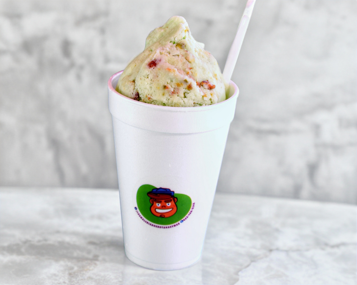 Hielito de pistache golpeado con un mazo hasta quedar finito como nieve de garrafa. Servido en vaso de 16 onzas