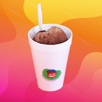 Hielito de chocolate natural golpeado con un mazo hasta quedar finito como nieve de garrafa. Servido en vaso de 16 onzas
