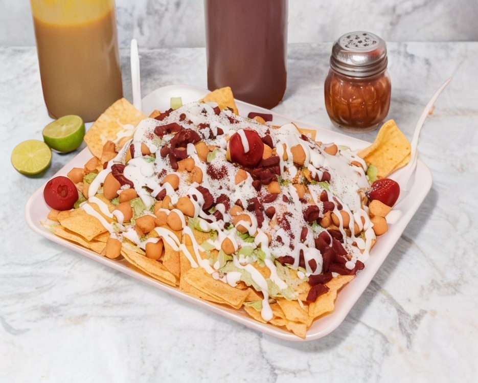 Frituras repollo, pepino, cacahuate, rielito, dulces diablitos, media crema, queso cotija, salsas y limon