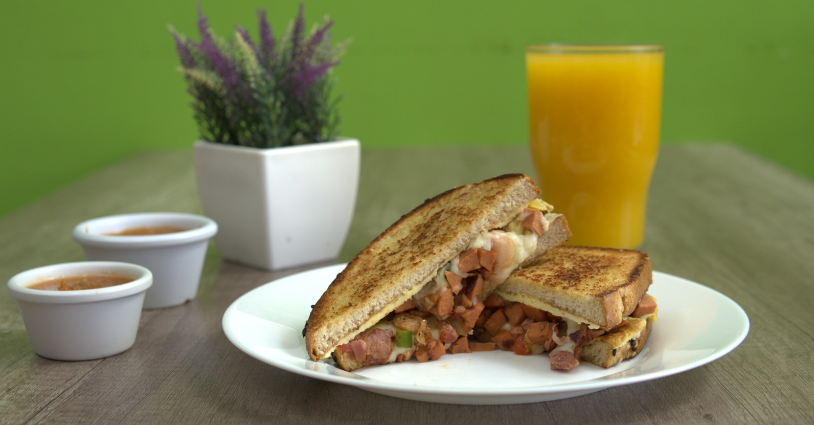 Delicioso pan integral con torta de huevo y 3 ingredientes de tu elección, con queso chihuahua gratinado. Acompañado de frijoles.