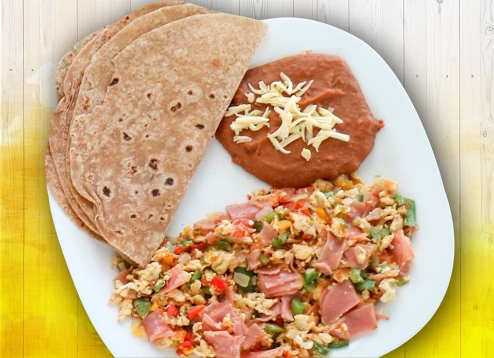 Mejoramos nuestra receta!!! Deliciosa torta de huevo, con 3 de tus ingredientes favoritos, con queso chihuahua, acompañados con frijoles, y tu elección de pan tostado con mantequilla ó un hot cake.