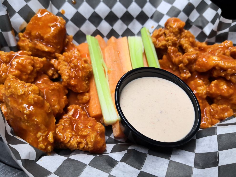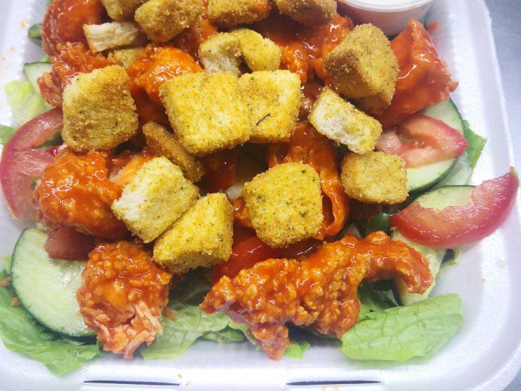 boneles en la salsa de tu eleccion, servido sobre una cama de lechuga orejona, zanahoria rayada, tomate, pepino y cruton, con aderezo ranch. Salsa: Buffalo Habanero, Tamarindo, BBQ chipotle, Búfalo, BBQ, Mango