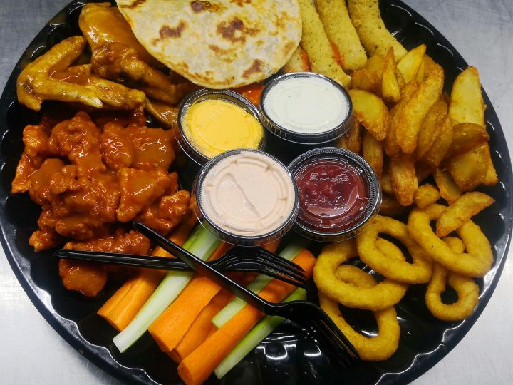 Charola con media orden de boneless, alitas, keka de boneless (en la salsa de su elección) dedos de queso, aros de cebolla, papas sazonadas, acompañado con aderezos, queso y salsa de tomate. Salsa: búfalo habanero, tamarindo, BBQ chipotle, búfalo, BBQ, mango.