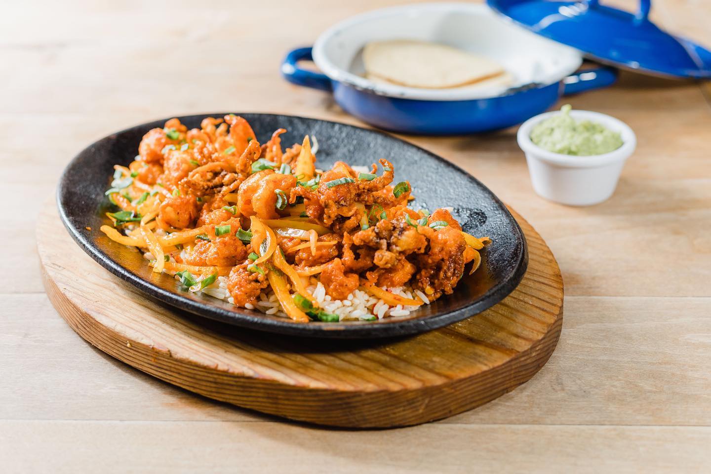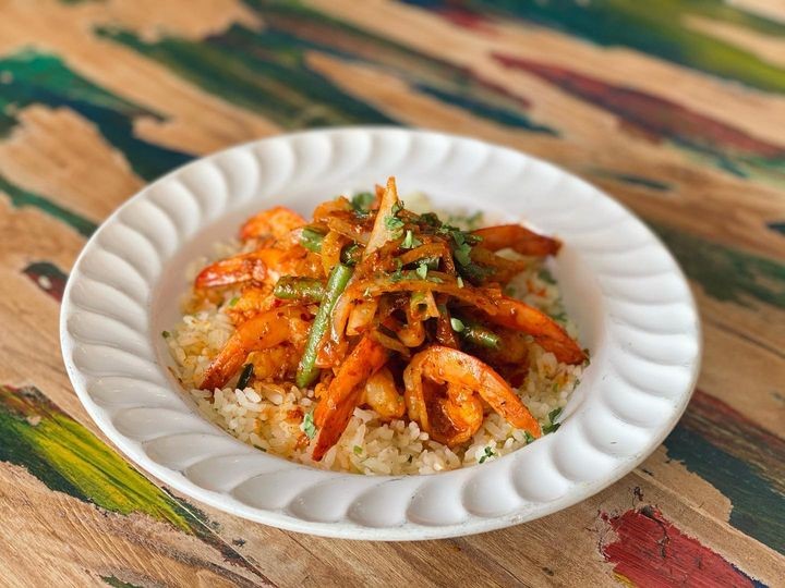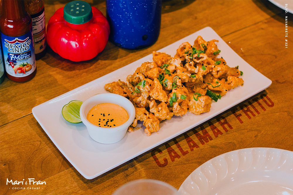 240 gr. calamar frito y camarón preparado con chile guerito, cebolla cambray y salsa, sriracha y chile de árbol servido en una cama de arroz.