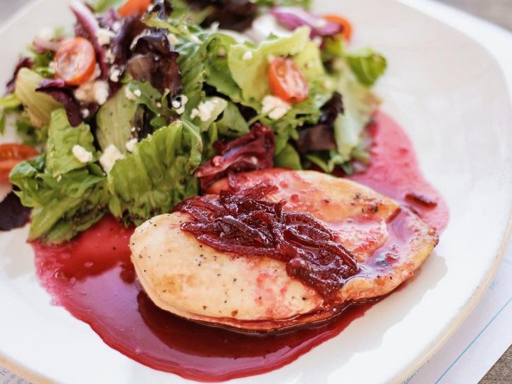 130 gr. pollo marinado en cítricos bañado en salsa de naranja y betabel.