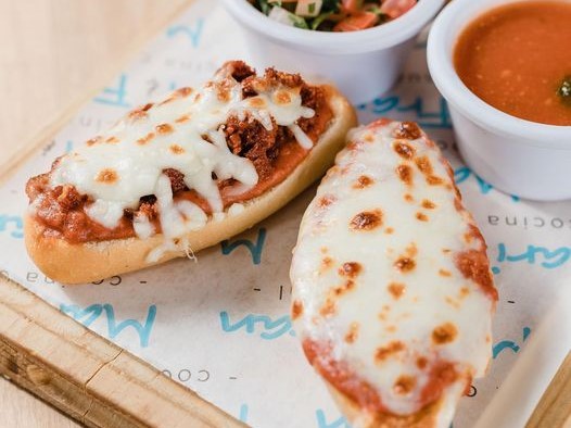 80 gr. con queso gratinado, ensalada de repollo y salsa banderita.