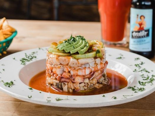 Camarón crudo, pulpo, pepino, jícama, zanahoria rallada y aguacate, bañada en salsa de aguachile verde.