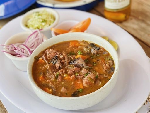 En caldo bichi, acompañado de frituras de maíz, aguacate, queso fresco y chile guajillo.