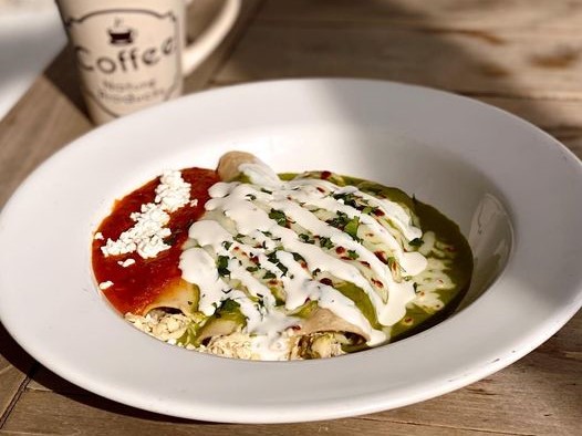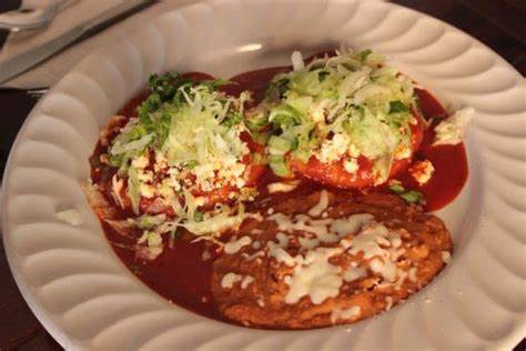 Masa de maíz bañadas en salsa de chile colorado con queso regional, lechuga, aceituna y rábano.