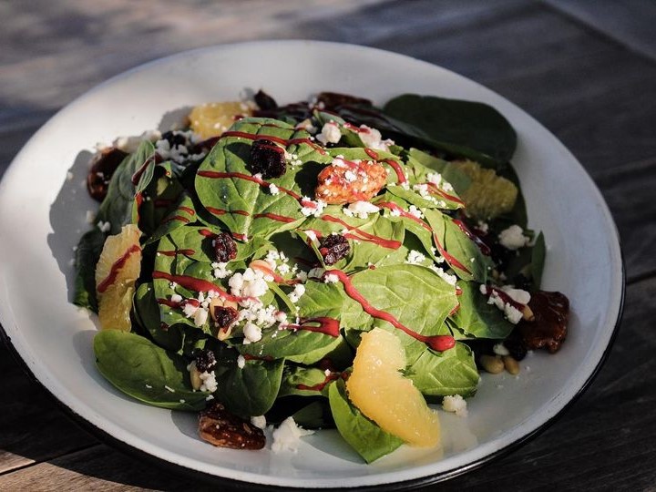 Espinaca fresca, nuez al caramelo, pasas, suprema de naranja, queso feta piñones, con aderezo de mango.