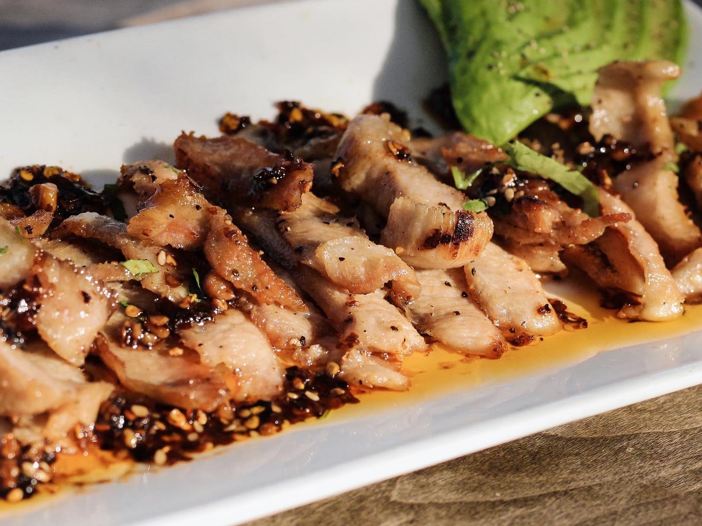 200 gr. papada de cerdo al carbón en salsa de aguachile de la casa y aguacate.