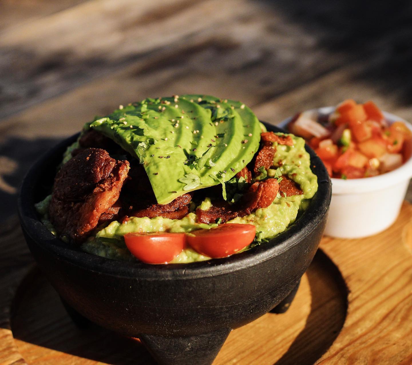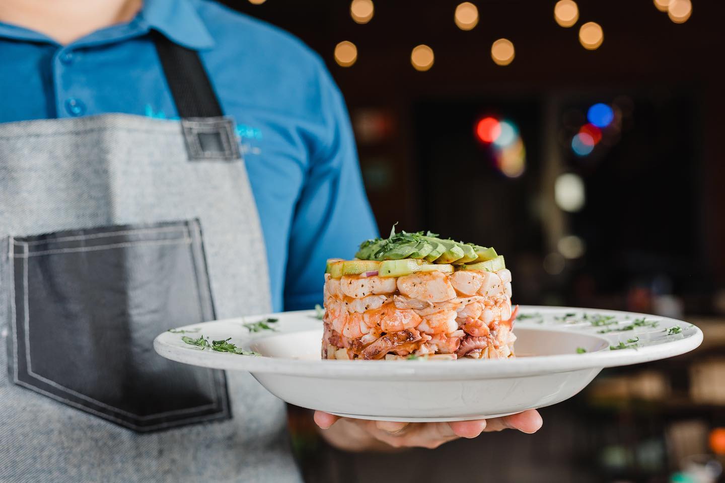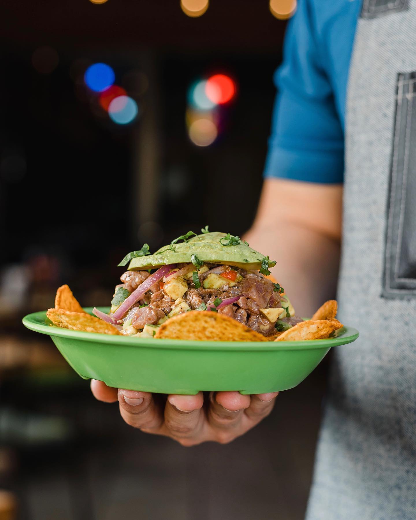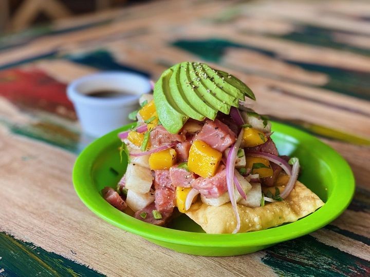 Atún fresco en cubos, jícama, mango, chile serrano, cebolla morada, jengibre, salsa ponzu, cilantro y aguacate.