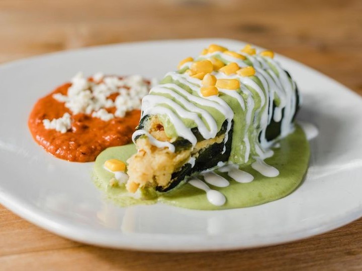 Rellenas de pollo, bañadas en salsa de crema de chile poblano, gratinadas y acompañadas de frijoles.