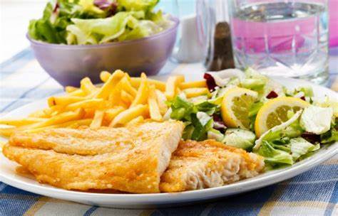200 gr. filete de pescado empanizado acompañado de ensalada de papa o papas a la francesa.