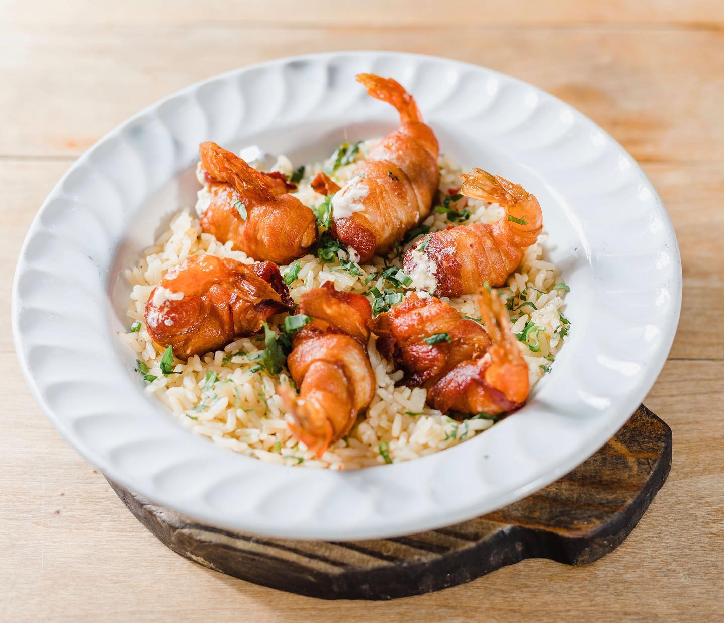 140 gr. rellenos de queso crema envueltos en tocino acompañados de salsa tártara y arroz.