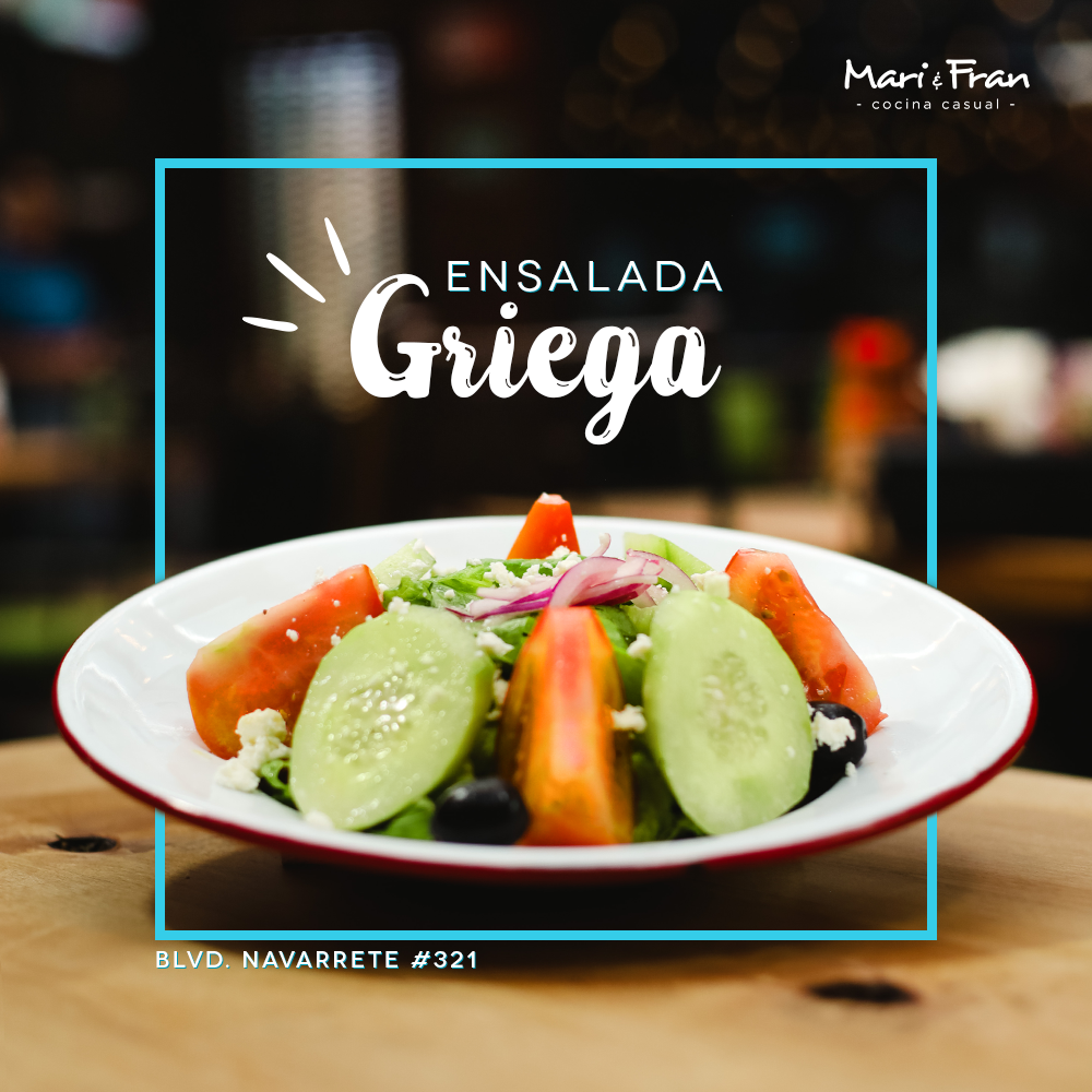 Combinación de lechugas verdes, gajos de tomate, pepino, cebolla morada, aceitunas negras, queso feta con aderezo de limón real: natural con pollo o camarón.