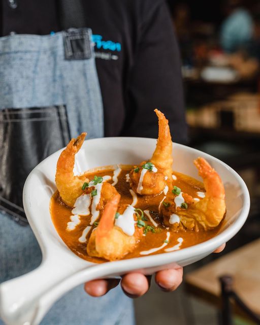 Camarón capeado en tempura, bañado en salsa de chiles secos y crema.