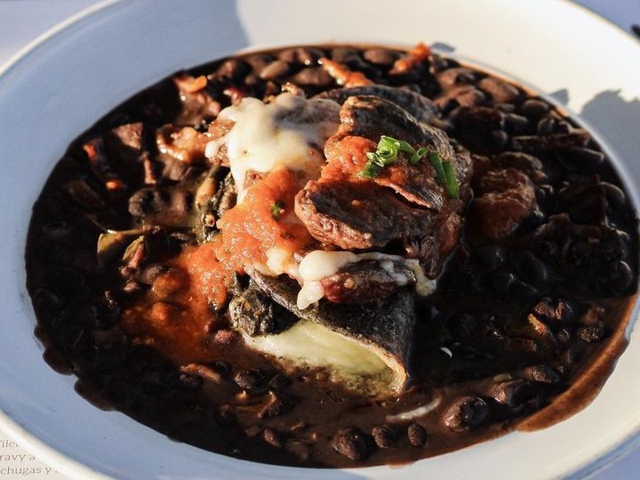 130 gr. arrachera montada en una quesadilla de huitlacoche y espejo de frijol negro charro, bañado en salsa roja de tomate al chipotle.