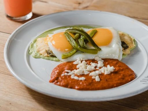 Tamal de elote con dos huevos estrellados encima bañado en crema de chile poblano acompañado de frijoles.