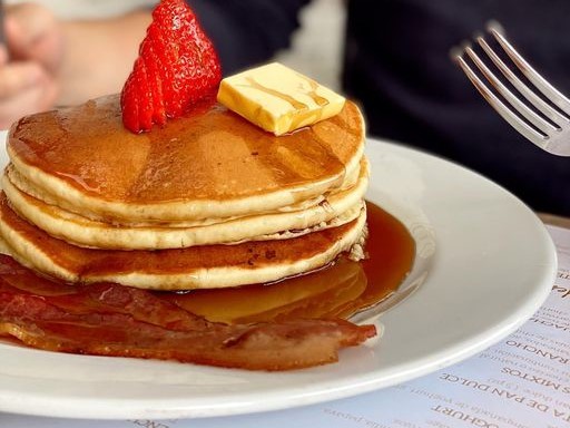 Tres hot cakes con mantequilla, tocino y miel de maple.