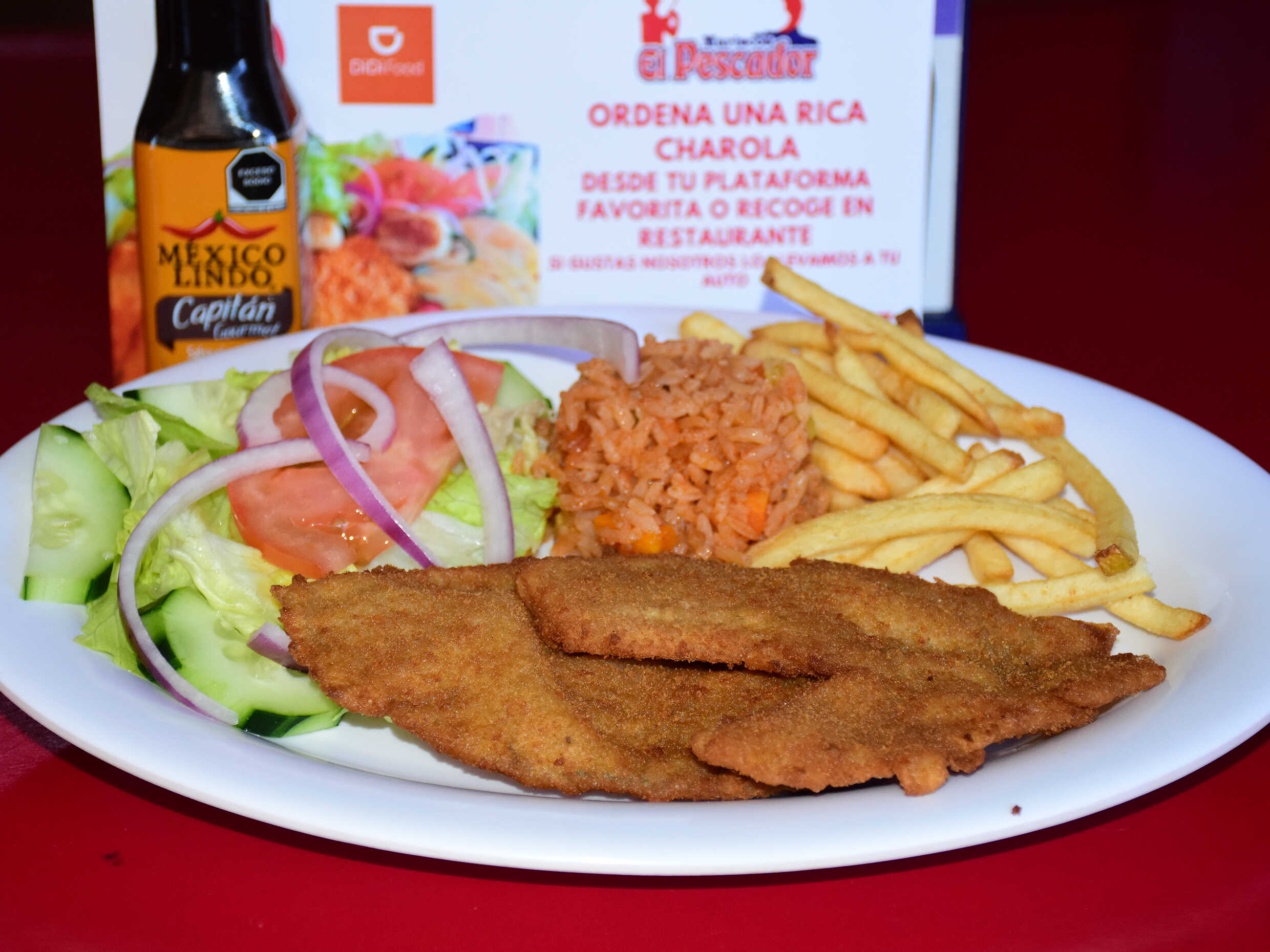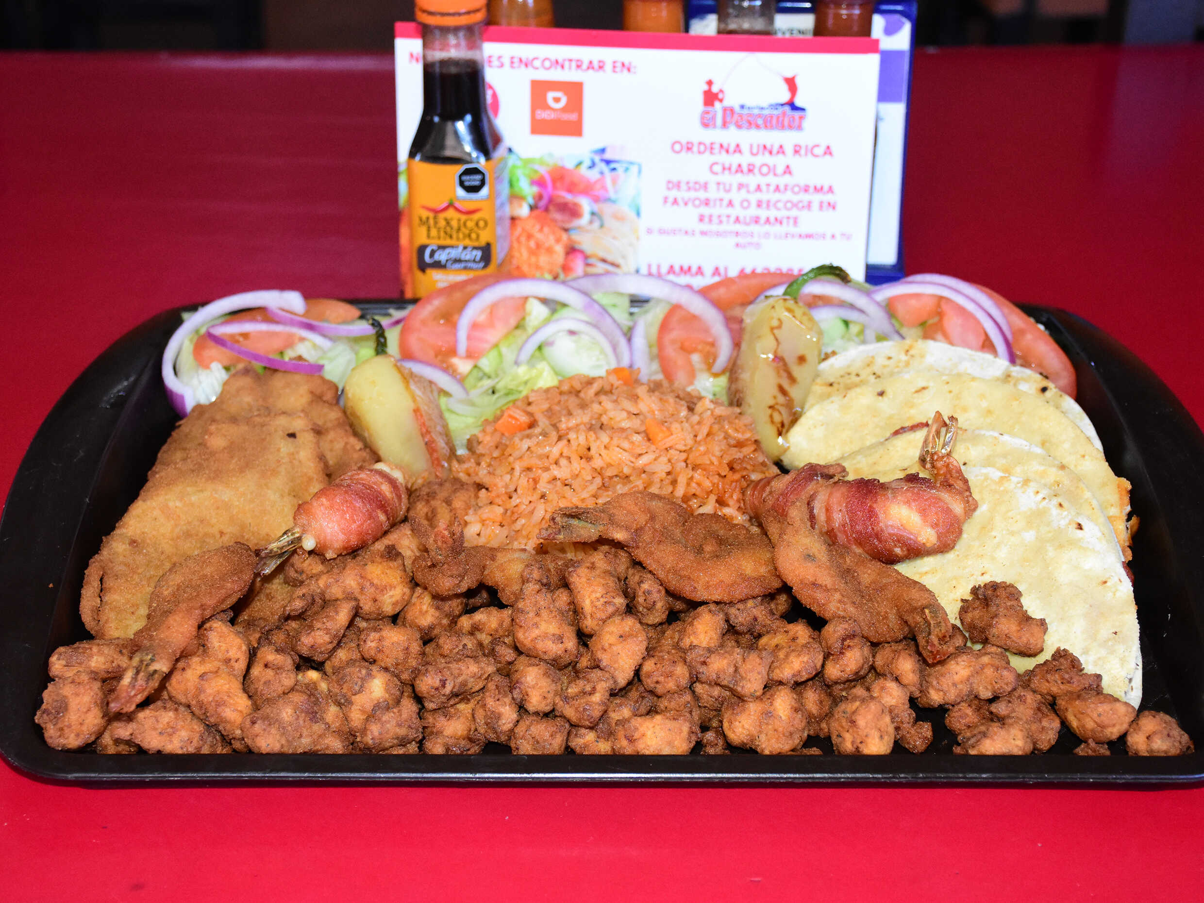 Charola con camarón empanizado, williams, pescado empanizado, chicharrón de pescado, tacos gobernador, quesadillas de marlin, chiles rellenos de marlin, arroz y ensalada, medio litro de jugo, bichy, tortillas, totopos y salsas.
