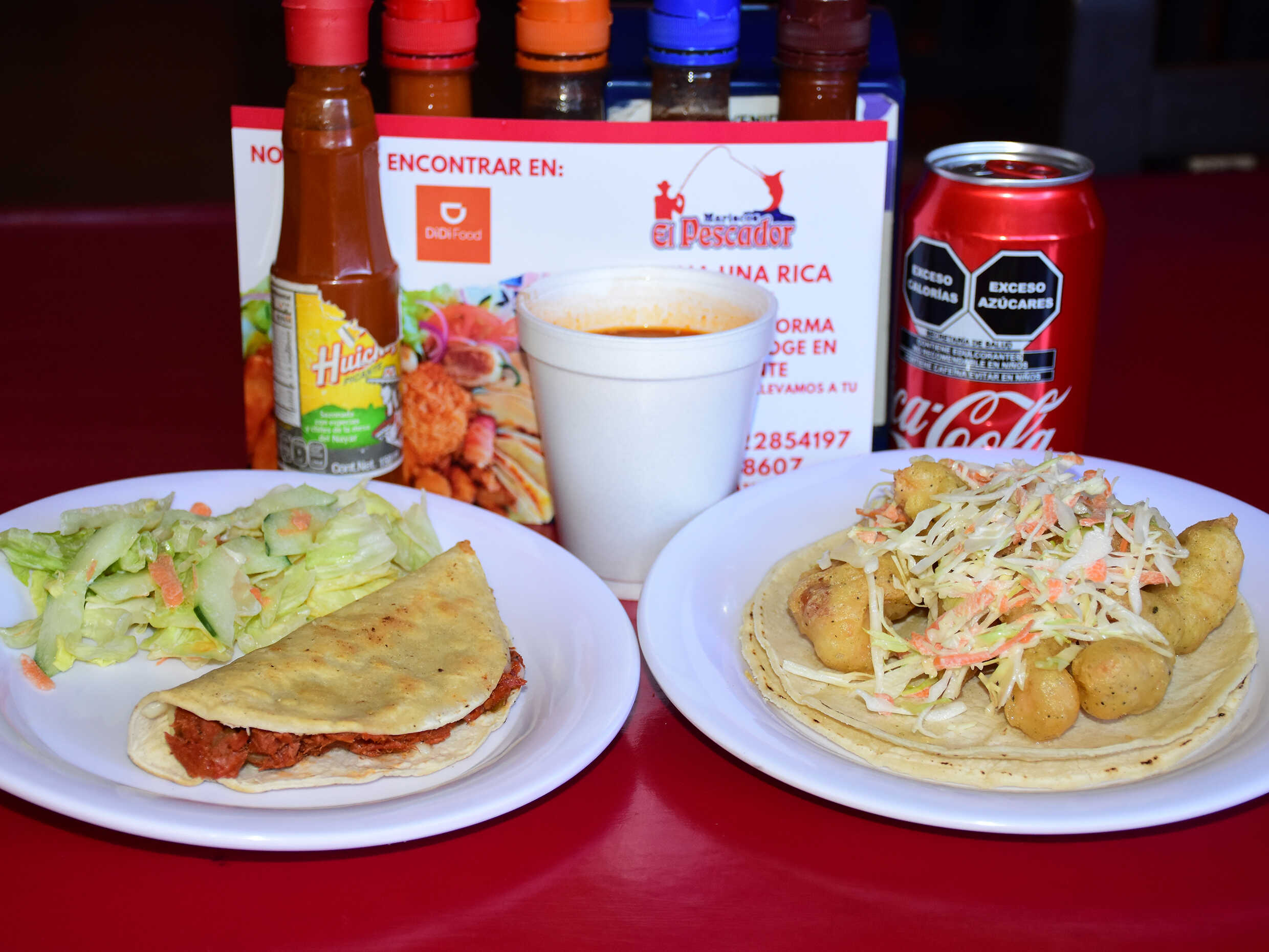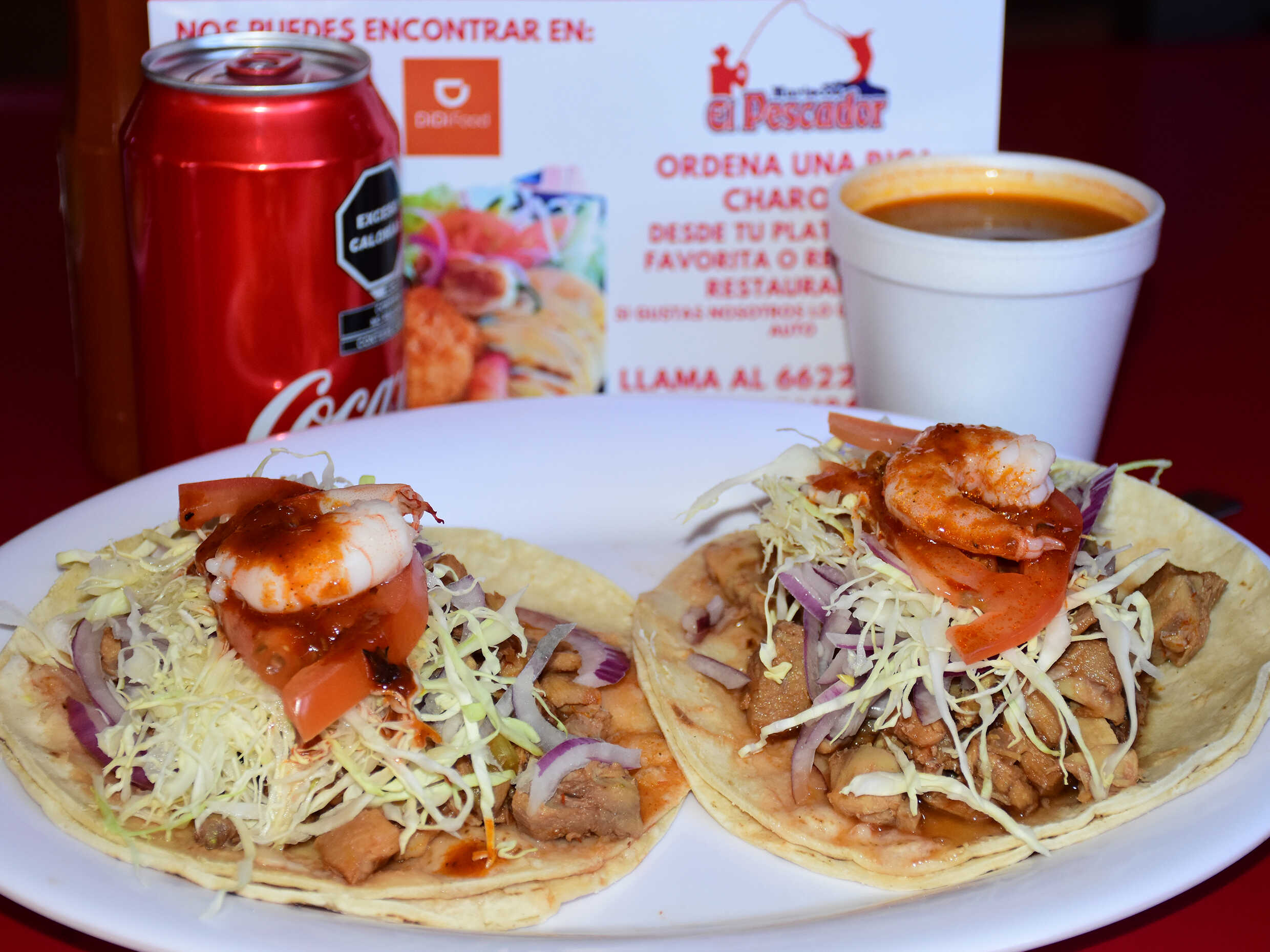 Taco Fish de Pescado*1 + Taco Fish de Camarón*1 + Jugo Bichy*1 + Coca Cola Light*1