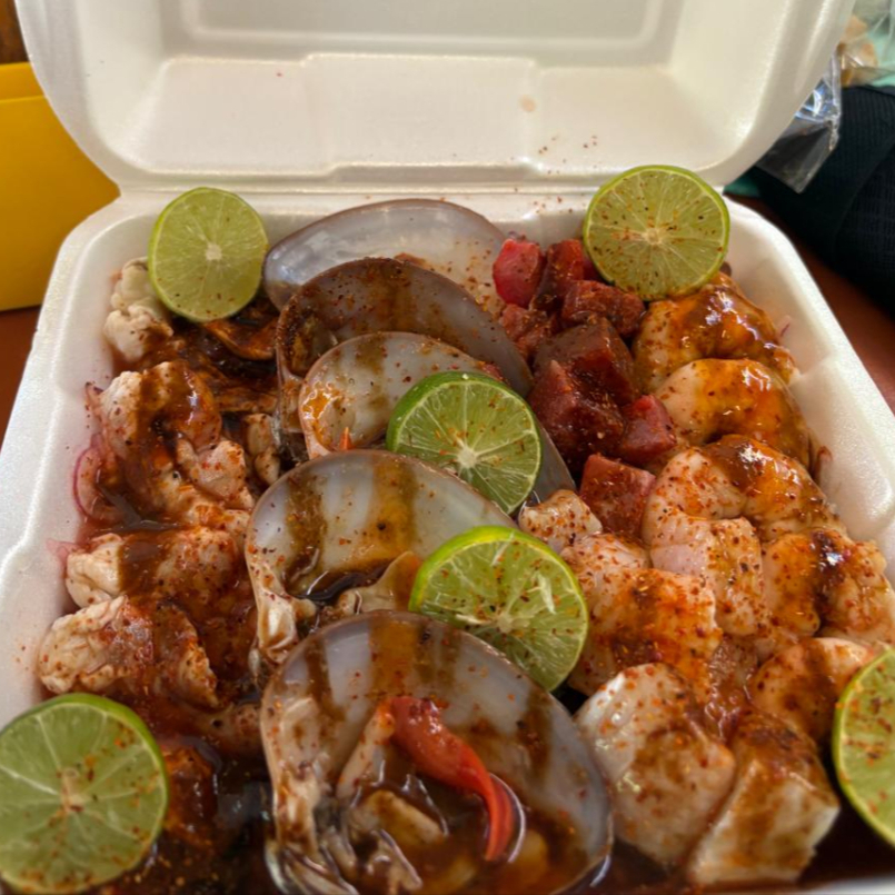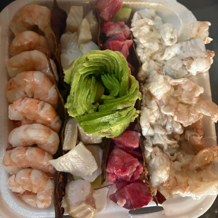 MARISCADA MIXTA DE 2-3 PERSONAS. 100 GRAMOS DE CAMARON COCIDO, 100 GRAMOS DE CAMARON AGUACHILE, 100 GRAMOS DE CALLO, 100 GRAMOS DE ATUN OPCION Y AGUACATE