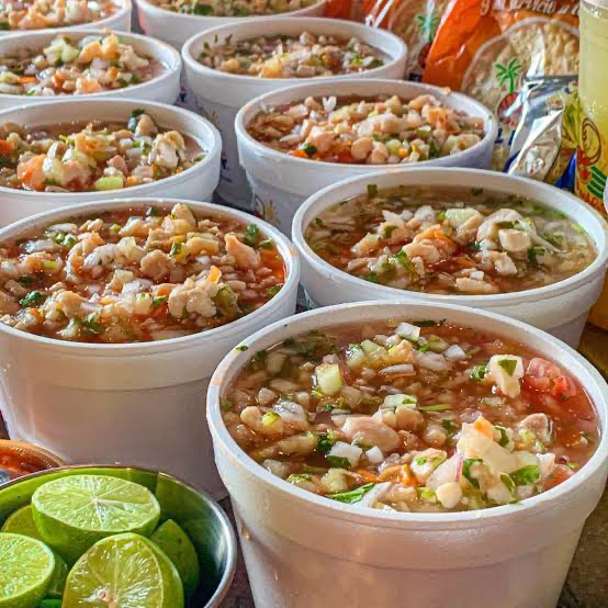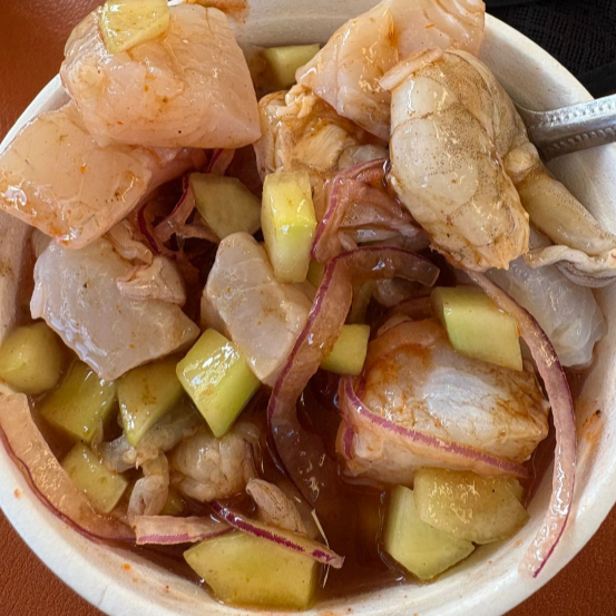 Base de ceviche, agrega tres mariscos de estos: Camarón cocido, camarón crudo, callo de pescado y atún fresco