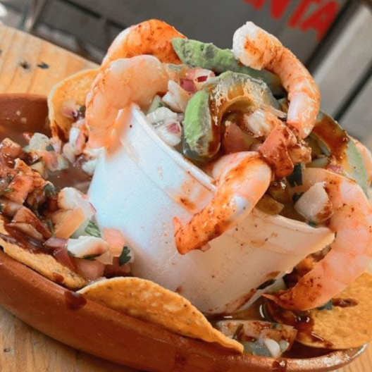 Coctel de Camarones tamaño grande, Clamato, Jugo de Camaron, verdura. Acompañado de Totopos
