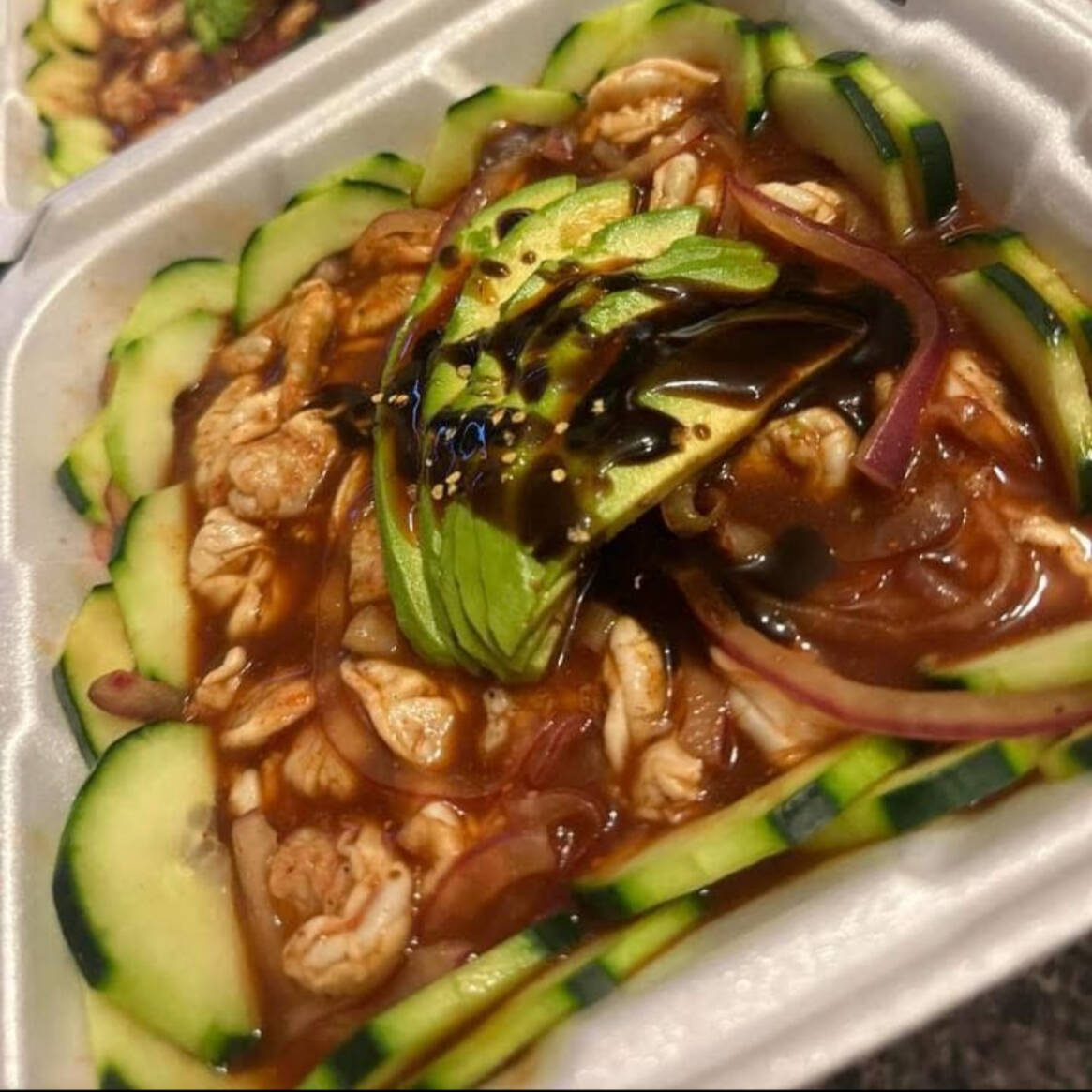 PEPINO, CEBOLLA MORADA, 15 CAMARONES CURTIDOS EN LIMON, Y SALSEADO ESPECIAL