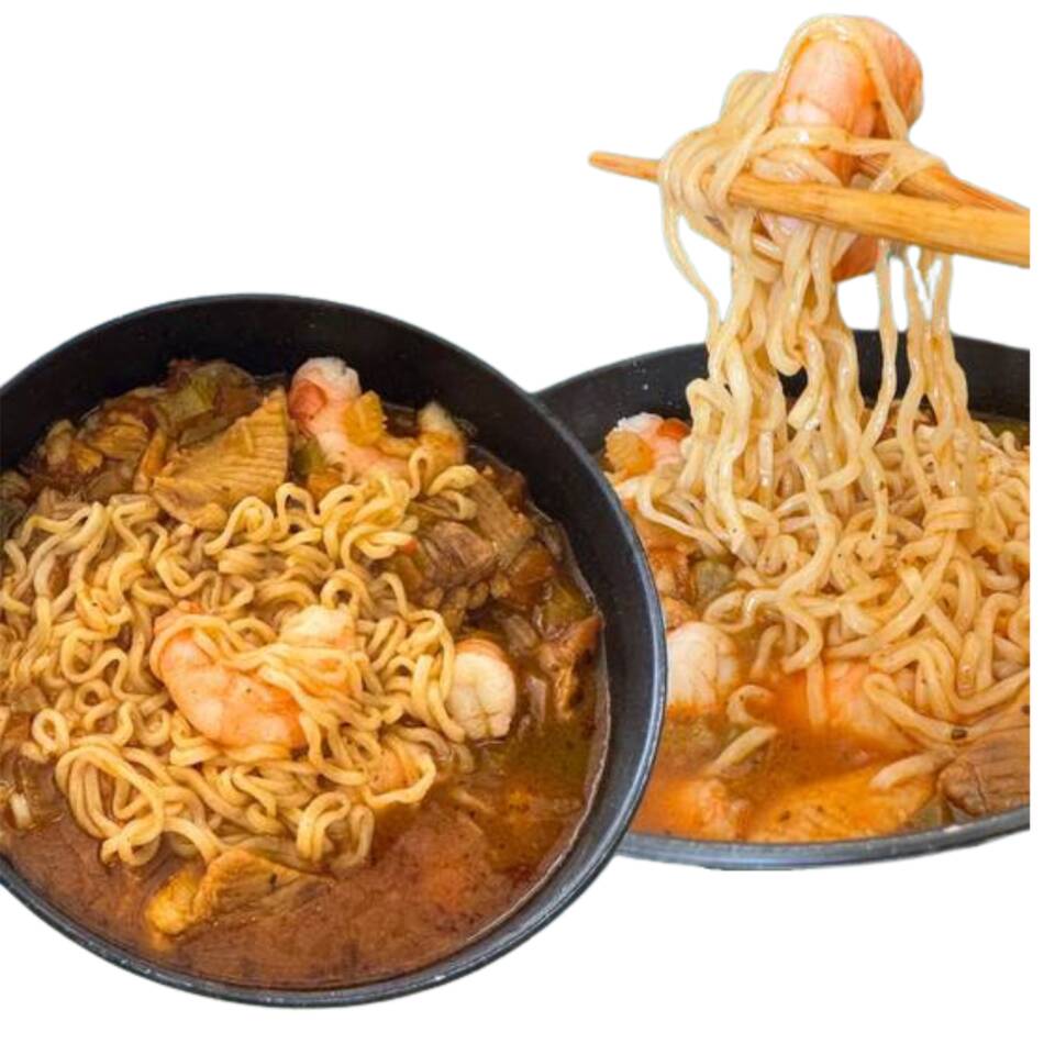 Fideos marcha maruchan con jugo vichi, cahuamanta y camaron, enviado con verduras a elegir, totopos o tortilla