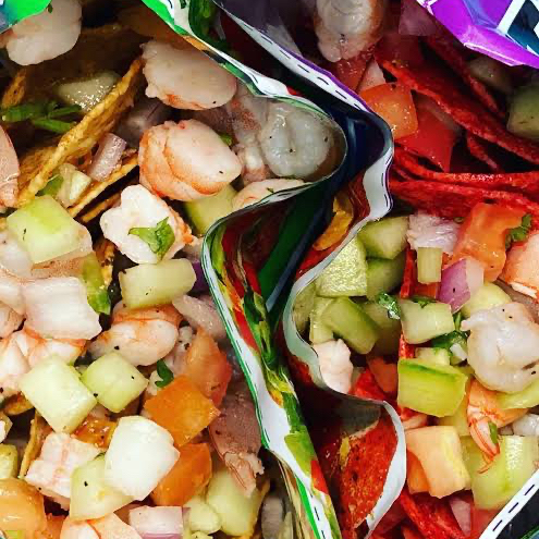 Orden de Medio litro de ceviche de Pescado con Camarones enteros, verdura, Clamato, totopos y Salsas