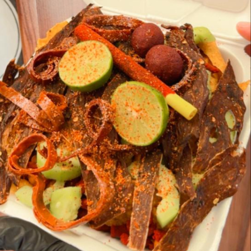 150 Gramos de Cueritos Calidad Prime Combinado con Pepino Fresco, Cebolla Morada Curtida, Limon, Clamato y Salseado Especial de la Casa