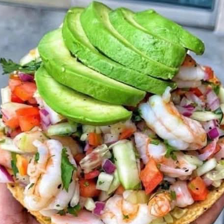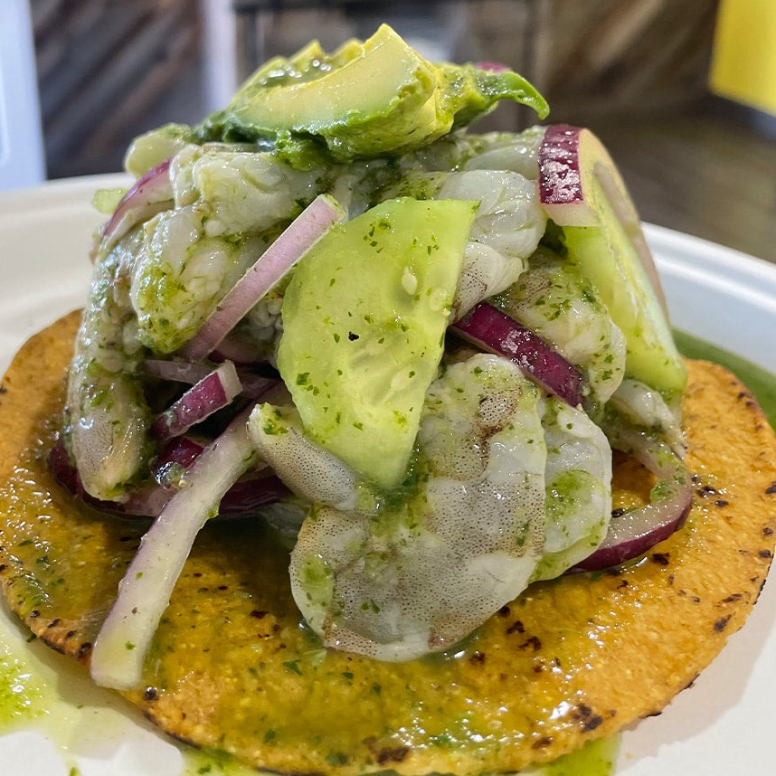 TOSTADA CEVICHE MIXTO CAMARÓN CURTIDO CON PESCADO, SALSA DE LA CASA Y AGUACATE
